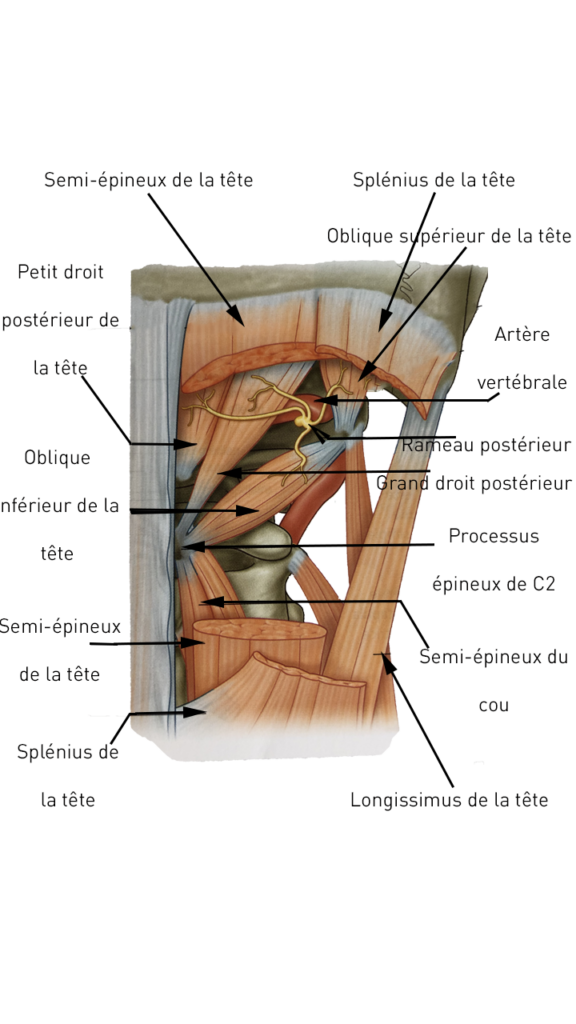 • Les muscles suboccipitaux (grand droit postérieur de la tête, petit droit postérieur de la tête, oblique supérieur de la tête et oblique inférieur de la tête) permettent également l’extension de la tête. Ils sont situés sous le semi-épineux de la tête.